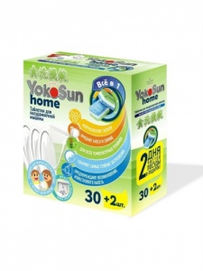 Таблетки для посудомоечной машины YokoSun. Специально разработаны для домашних посудомоечных машин всех типов. Эффективно и деликатно удаляют самые стойкие загрязнения при любых температурных режимах, не оставляя разводов на поверхности посуды и неприятного запаха. Одна таблетка включает в себя все функции таблеток All in 1.