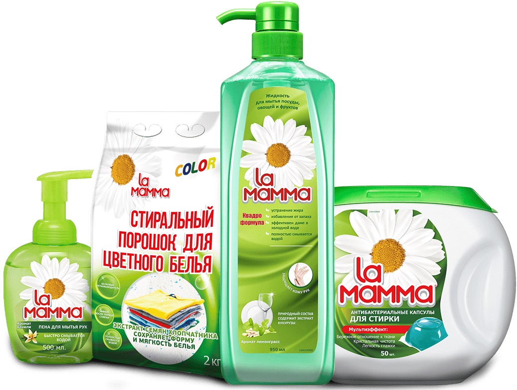 La mamma – всегда с вами и вашей семьей: она в чистоте и безопасности ваших рук и рук вашего ребенка; она в отсутствии бактерий и пестицидов на овощах и фруктах в вашем доме; она в удобстве и эффективности стирки ваших вещей, а также в кристальной белизне белого и сохранении красок цветного белья. Она создана для вас и вашей семьи с любовью и заботой, сокращая время на стирку и расходы бюджета для более важных моментов в вашей жизни!